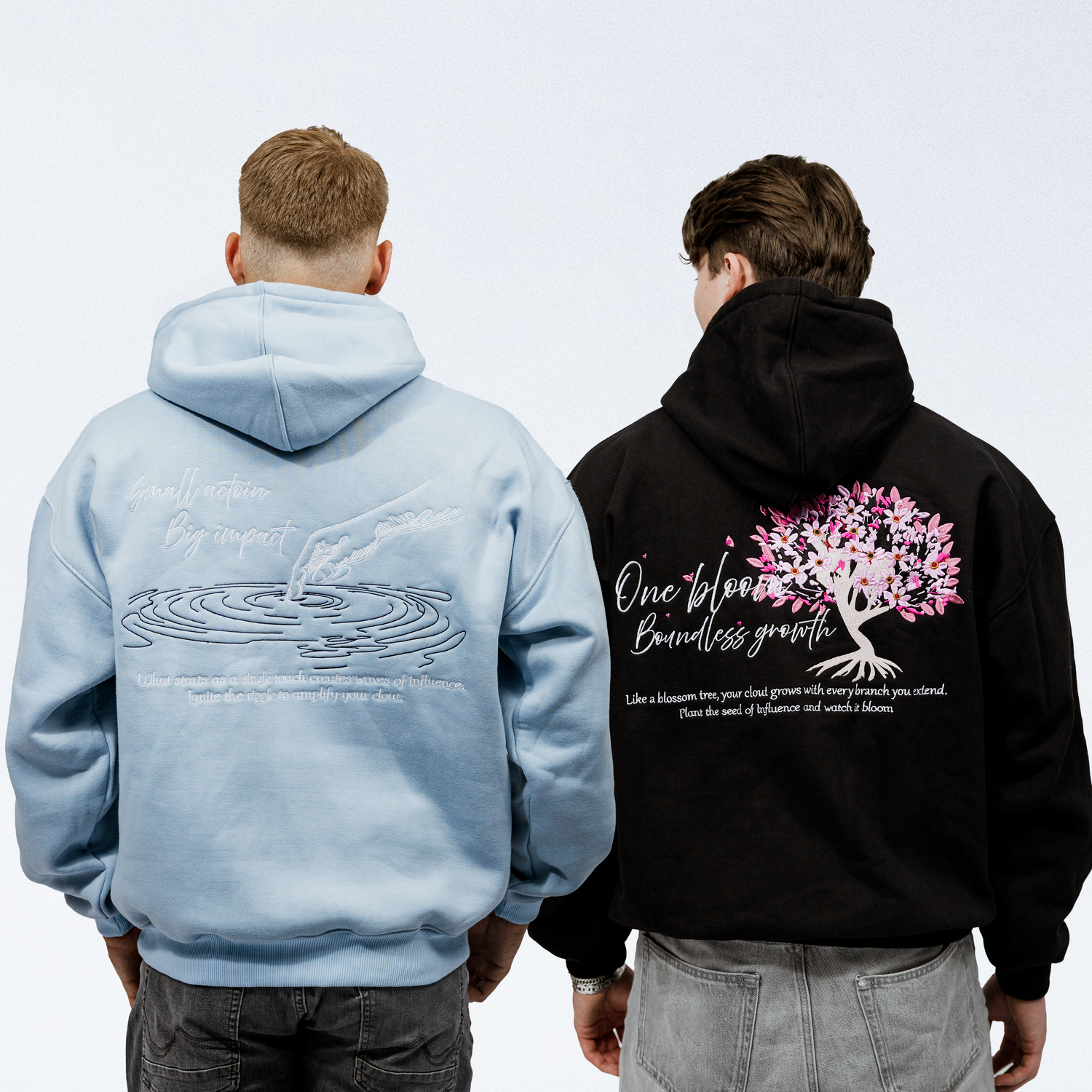Our backprint hoodies combine comfort with creative expression. Made from heavyweight 100% cotton, they offer a relaxed fit with lasting softness and structure. Each piece features a bold back design—light blue with a ripple-inspired artwork and black with a delicate blossom tree—paired with uplifting quotes to inspire movement, reflection, and individuality.